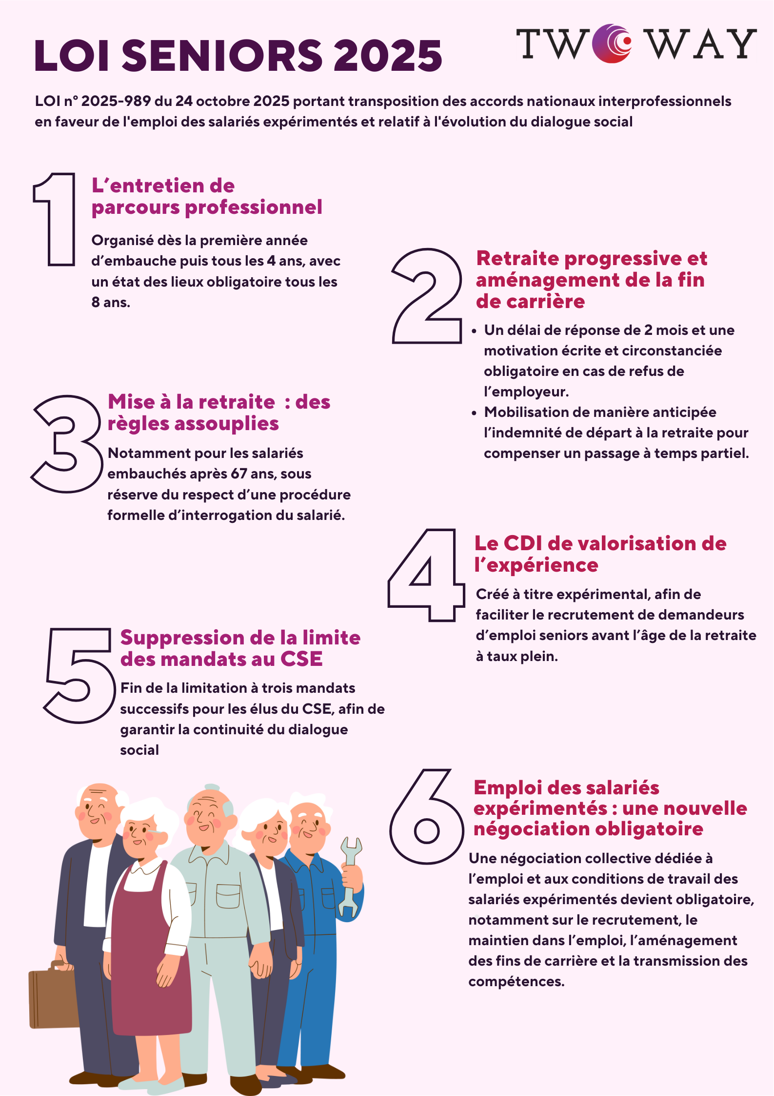 Afin d’en faciliter la lecture et d’en retenir l’essentiel, nous avons également conçu une infographie qui reprend les principaux dispositifs de la loi « Senior » et leurs impacts concrets pour les employeurs.